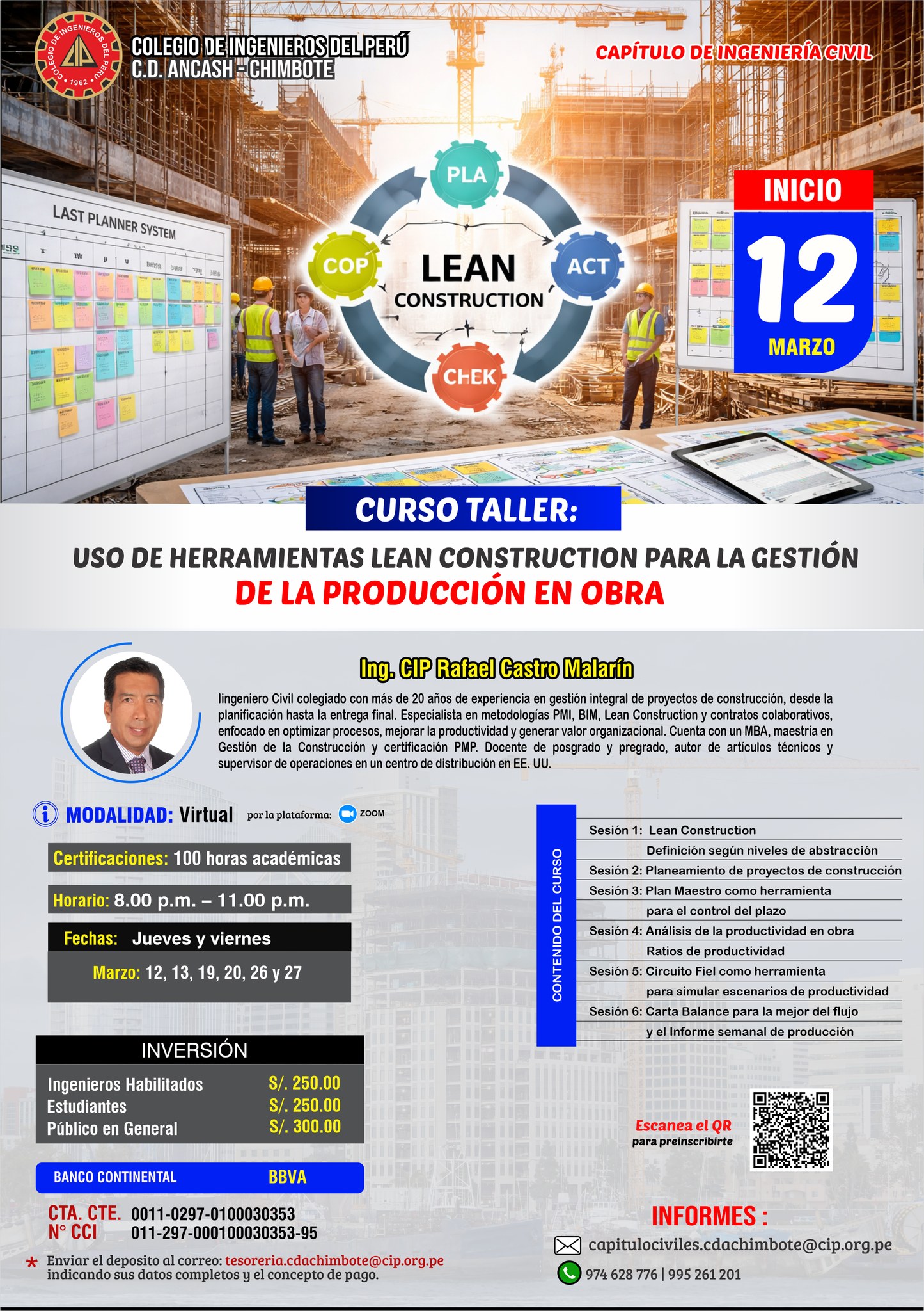 CURSO TALLER: USO DE HERRAMIENTAS LEAN CONSTRUCTION PARA LA GESTION DE LA PRODUCCION EN OBRA